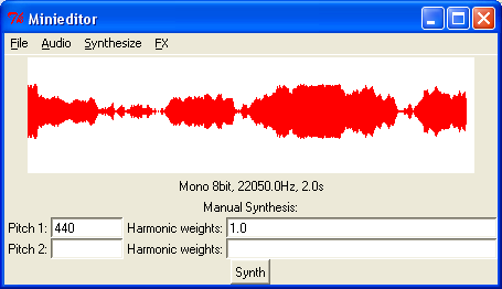 The GUI isn't very good, but I have most of the important features covered: Adding Silence, Cut, Append File, Mix File, Modulate, Make Louder, Make Softer. It loads and saves standard wav files (16 bit or 8bit), so it is actually practical for editing things you have recorded.
